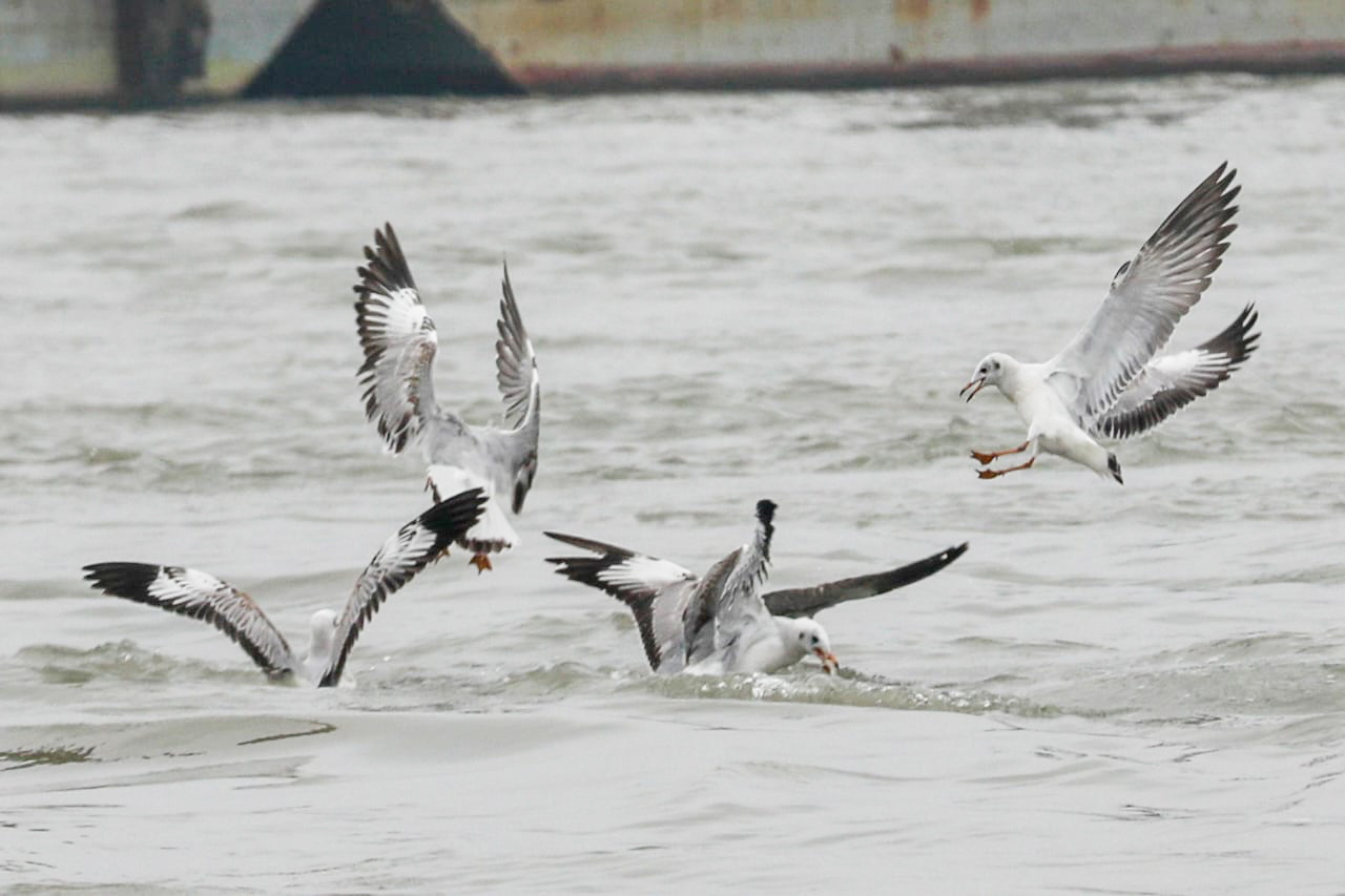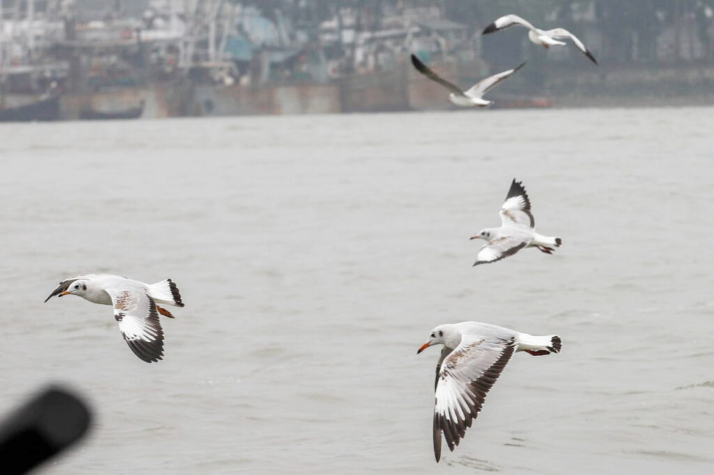 শীতের সকালে খাবারের খোঁজে কর্ণফুলী নদীর তীরে ভিড় জমিয়েছে গাঙচিলের দল।