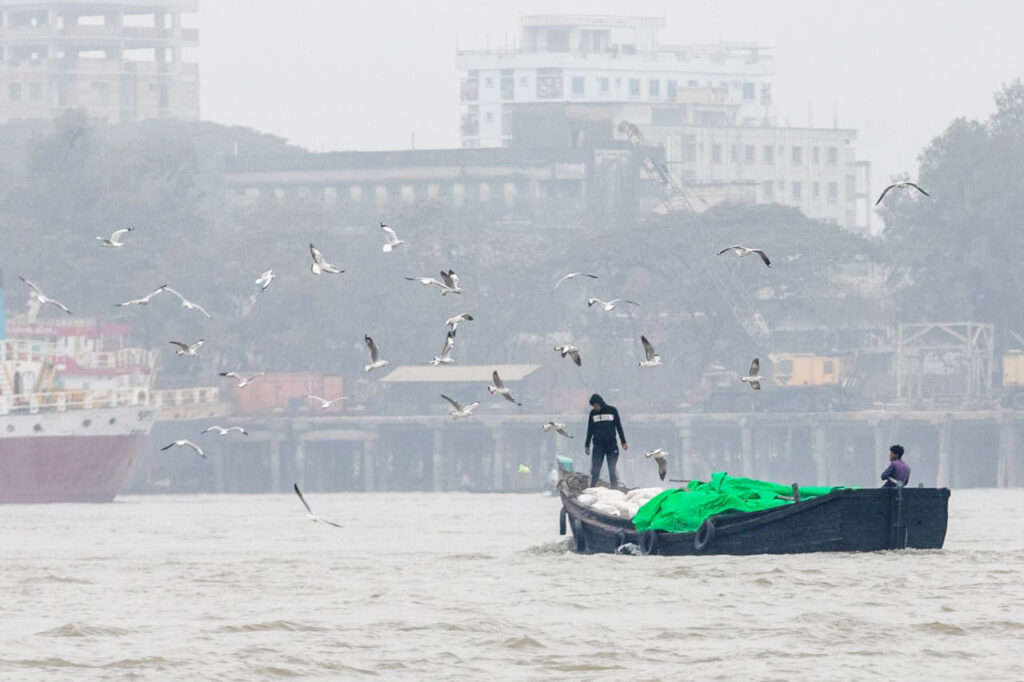 কুয়াশার চাদরে ঢাকা কর্ণফুলী নদীর তীরে উড়ছে গাঙচিল। কখনো ক্লান্ত হয়ে ভাসছে পানিতে, খুঁজে বেড়াচ্ছে মাছ।