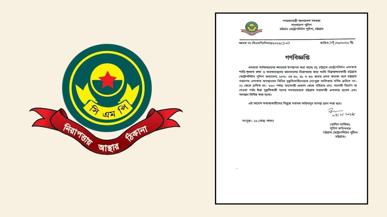 গণবিজ্ঞপ্তিতে জানানো হয়, চট্টগ্রাম মেট্রোপলিটন পুলিশ অধ্যাদেশ, ১৯৭৮-এর ৪০, ৪১ ও ৪৩ ধারায় প্রদত্ত ক্ষমতাবলে মহানগর এলাকায় অবস্থানরত বিভিন্ন দুষ্কৃতিকারীকে চট্টগ্রাম মহানগরী থেকে বহিষ্কার করা হয়েছে। একইসাথে পরবর্তী নির্দেশ না দেওয়া পর্যন্ত এসব দুষ্কৃতিকারী দলের সদস্যদের চট্টগ্রাম মহানগরীতে প্রবেশ ও অবস্থান সম্পূর্ণভাবে নিষিদ্ধ ঘোষণা করা হয়েছে।