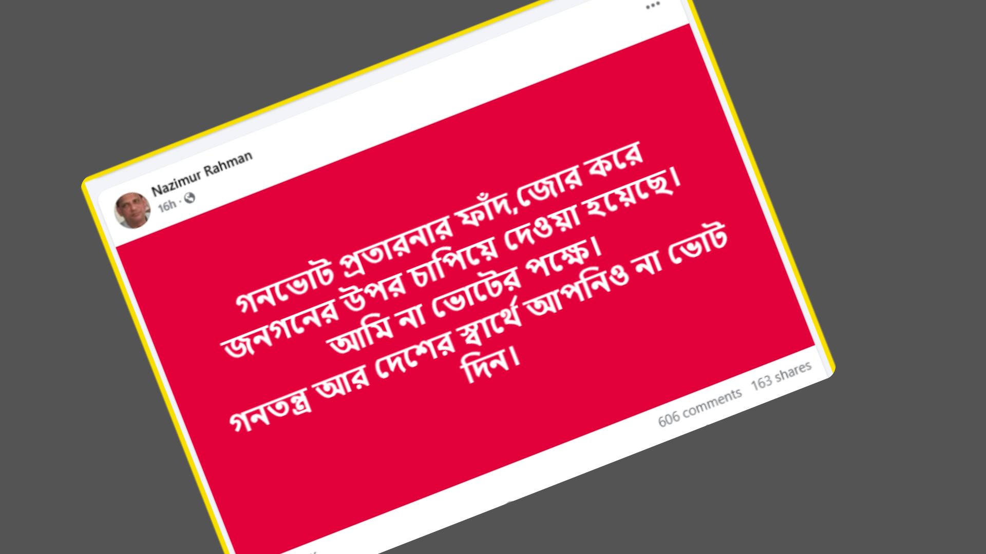 বুধবার রাতে নিজের ফেসবুক অ্যাকাউন্টে দেওয়া ওই পোস্টে নাজিমুর রহমান লিখেছেন, ‘গণভোট প্রতারণার ফাঁদ, জোর করে জনগণের ওপর চাপিয়ে দেওয়া হয়েছে। আমি না ভোটের পক্ষে। গনতন্ত্র আর দেশের স্বার্থে আপনিও না ভোট দিন।’