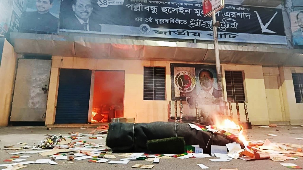 এতে পরিস্থিতি কিছুটা শান্ত হতেই কিছু নেতাকর্মী পেছন দিক থেকে এসে জাতীয় পার্টির কার্যালয়ের সামনে স্লোগান দিয়ে ভাঙচুর ও ইটপাটকেল নিক্ষেপ করতে শুরু করে। সেময় পুলিশ সদস্যরা রমনা থানার দিকে কিছুটা পিছু হটে। এসময় জাতীয় পার্টির কার্যালয়ের নিচে একটি স্টোররুমের গেট ভেঙে অগ্নিসংযোগ করা হয়।