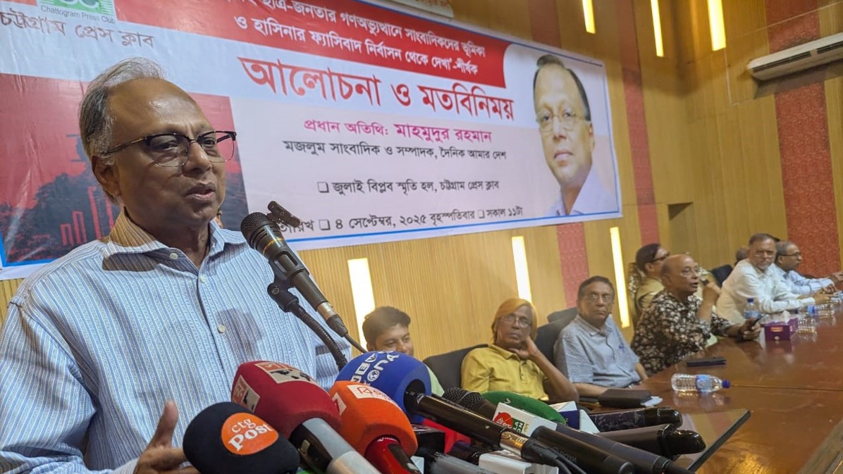 বৃহস্পতিবার সকালে চট্টগ্রাম প্রেস ক্লাব আয়োজিত ‘জুলাই ছাত্র গণঅভ্যুত্থানে সাংবাদিকদের ভূমিকা ও হাসিনার ফ্যাসিবাদ নির্বাসন থেকে দেখা’ শীর্ষক আলোচনায় প্রধান অতিথির বক্তব্যে এসব বলেন তিনি। অনুষ্ঠানে সভাপতিত্ব করেন চট্টগ্রাম মেট্রোপলিটন সাংবাদিক ইউনিয়নের সভাপতি মো. শাহনওয়াজ। স্বাগত বক্তব্য দেন চট্টগ্রাম প্রেস ক্লাবের সদস্যসচিব ও আমার দেশ’র আবাসিক সম্পাদক জাহিদুল করিম কচি।