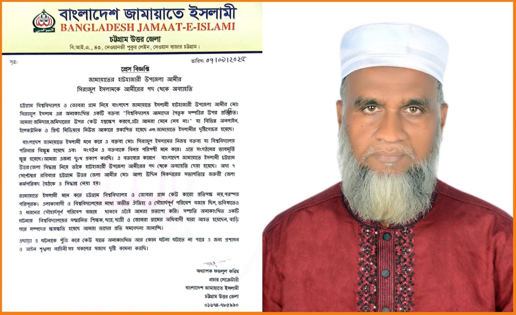 বিজ্ঞপ্তিতে জানানো হয়, কেন্দ্রের নির্দেশনা ও জেলা আমীর মো. আলাউদ্দিন সিকদারের সভাপতিত্বে অনুষ্ঠিত জরুরি কর্মপরিষদ বৈঠকের সিদ্ধান্ত অনুযায়ী সিরাজুল ইসলামকে তাৎক্ষণিকভাবে পদ থেকে অব্যাহতি দেওয়া হয়েছে। তবে তাঁকে শোকজ করা হয়নি। সংগঠন বলছে, তাঁর উক্তি সম্পূর্ণ ‘নিজস্ব’ এবং জামায়াতের নীতি ও অবস্থানের সঙ্গে সাংঘর্ষিক।