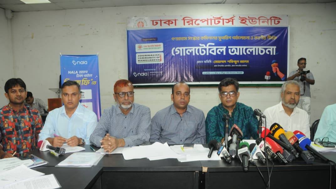 শনিবার (১৩ সেপ্টেম্বর) ঢাকা রিপোর্টার্স ইউনিটির (ডিআরইউ) শফিকুল কবির মিলনায়তনে আয়োজিত ‘গণমাধ্যম সংস্কার কমিশনের সুপারিশ পর্যালোচনা ও করণীয়’ শীর্ষক গোলটেবিল আলোচনায় বক্তারা এ দাবি জানান। ডিআরইউ ও জার্নালিস্ট কমিউনিটি অব বাংলাদেশ যৌথ উদ্যোগে এই অনুষ্টানের আয়োজন করে।