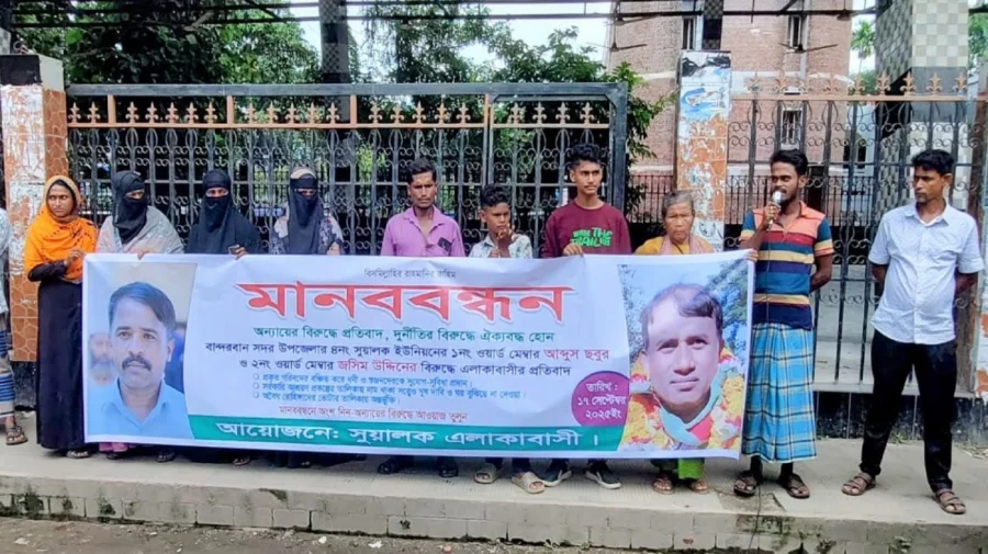বান্দরবান সদর উপজেলার সুয়ালক ইউনিয়নের ১নং ওয়ার্ড মেম্বার আব্দুর ছবুর ও ২নং ওয়ার্ড মেম্বার জসিম উদ্দিন- এই দুই ইউপি মেম্বারের বিরুদ্ধে খাদ্যশস্য আত্মসাৎ, গরিব অসহায়দের চাল বিতরণে অনিয়ম ও টাকার বিনিময়ে ভূমিহীনদের ঘর রোহিঙ্গাদের দেওয়াসহ বিভিন্ন দুর্নীতির অভিযোগে অপসারণের দাবিতে মানববন্ধন কর্মসূচি পালন করেছেন ভুক্তভোগীরা।