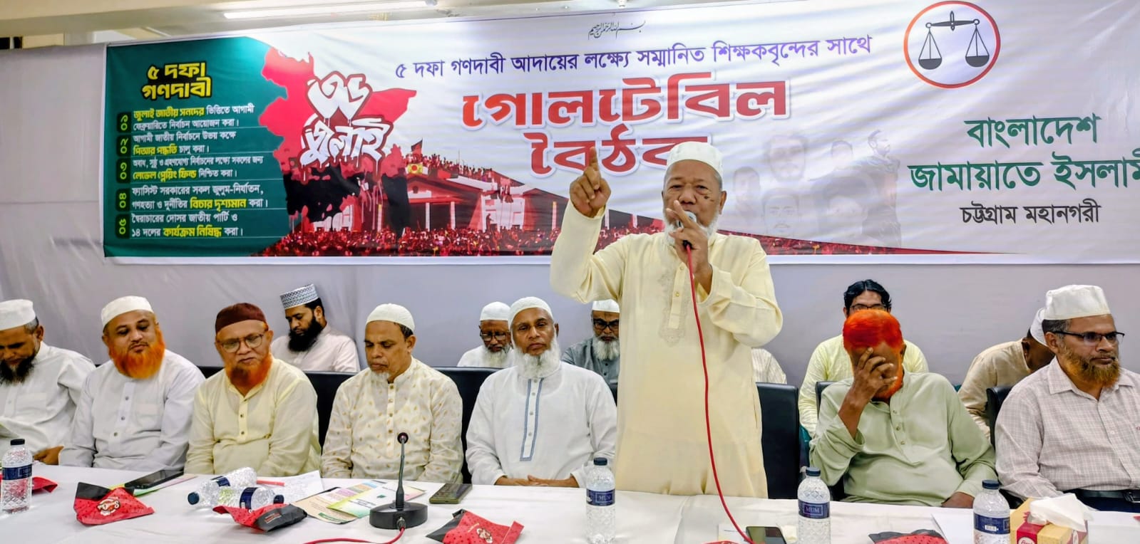 সভাপতির বক্তব্যে নগর জামায়াতের ভারপ্রাপ্ত আমীর মুহাম্মদ নজরুল ইসলাম বলেন, ‘জুলাই আন্দোলনে শিক্ষকদের অবদান ছিল ঐতিহাসিক। কিন্তু ফ্যাসিস্ট শক্তিকে উৎখাতের পরও রাজনৈতিক সংস্কৃতিতে কাঙ্ক্ষিত পরিবর্তন আসেনি। জুলাই বিপ্লবকে টেকসই করতে ৫ দফা দাবিতে আন্দোলন চালিয়ে যেতে হবে।’