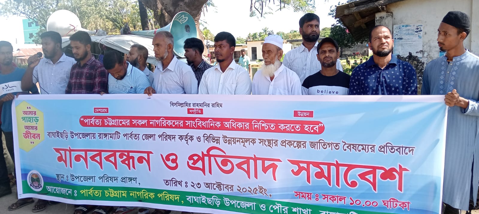 রাঙামাটি পার্বত্য জেলা পরিষদ ও বিভিন্ন উন্নয়ন সংস্থার প্রকল্পে জাতিগত বৈষম্য ও অনিয়মের অভিযোগে বাঘাইছড়িতে মানববন্ধন ও প্রতিবাদ সমাবেশ অনুষ্ঠিত হয়েছে। বৃহস্পতিবার (২৩ অক্টোবর) সকাল ১০টায় উপজেলা পরিষদ প্রাঙ্গণে পার্বত্য চট্টগ্রাম নাগরিক পরিষদ, বাঘাইছড়ি উপজেলা ও পৌর শাখার উদ্যোগে এ কর্মসূচি পালিত হয়।