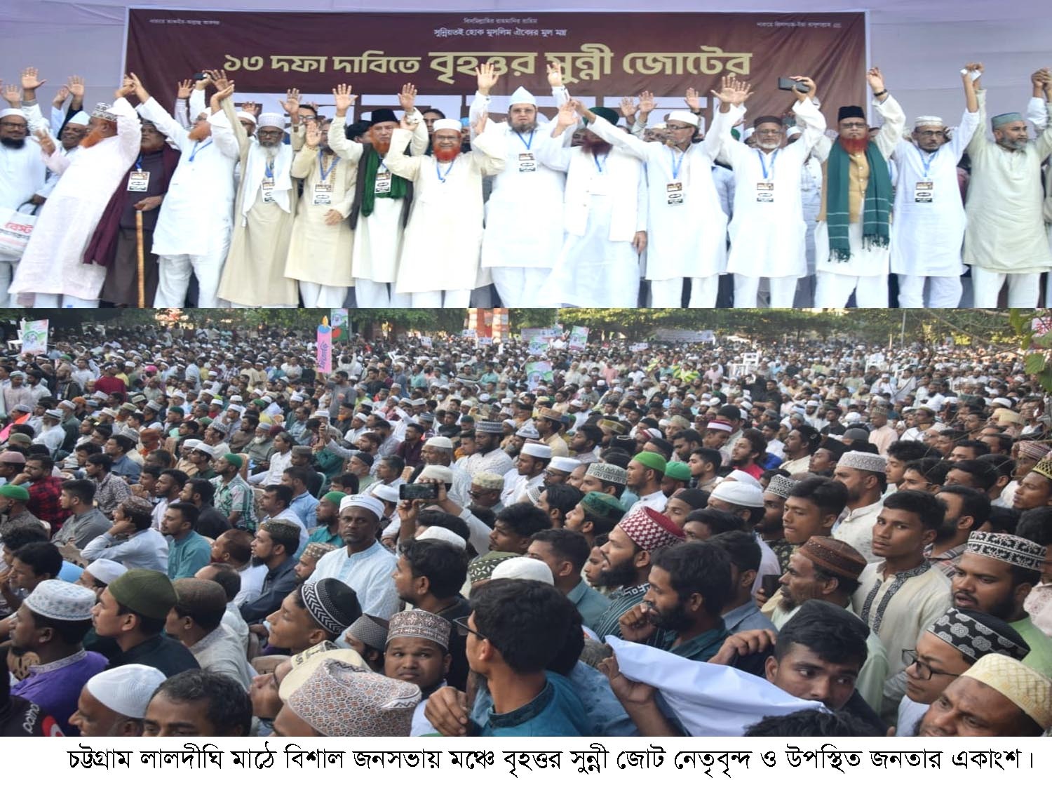 শনিবার (১৫ নভেম্বর) বিকালে চট্টগ্রাম লালদীঘি ময়দানে বৃহত্তর সুন্নী জোট চট্টগ্রাম জেলার বিশাল জনসভায় ১৩ দফা দাবি জানিয়ে সমাবেশে বক্তারা এসব কথা বলেন।সমাবেশে নেতারা অভিযোগ করেন, জুলাই সনদ ও রাষ্ট্রীয় সংলাপে নিবন্ধিত সব রাজনৈতিক দলের অংশগ্রহণ ও মতামত অন্তর্ভুক্ত না হওয়ায় নির্বাচন প্রক্রিয়া প্রশ্নবিদ্ধ হয়ে পড়েছে। তারা আশা প্রকাশ করেন, সরকার কোনো দলের প্রতি পক্ষপাত দেখাবে না এবং সমতাপূর্ণ পরিবেশে নির্বাচন নিশ্চিত করবে।