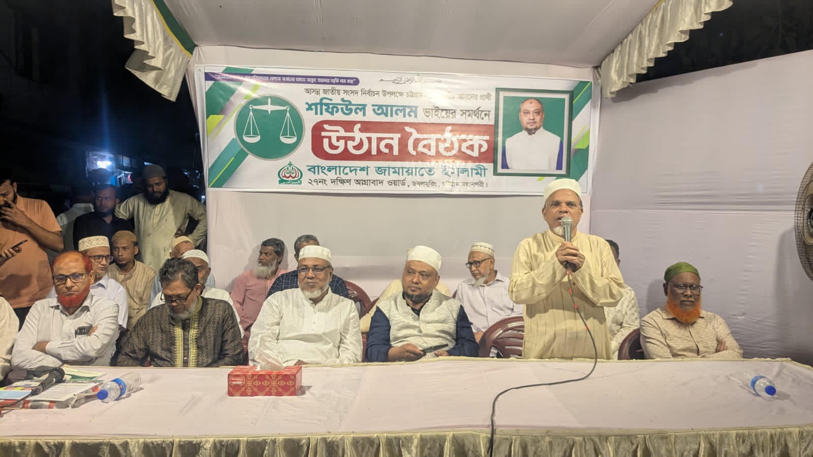ওয়ার্ড সেক্রেটারি মুহাম্মদ হায়দার আলীর সভাপতিত্বে এবং সিডিএ সাংগঠনিক ওয়ার্ড সেক্রেটারি বিল্লাল হোসেনের সঞ্চালনায় অনুষ্ঠিত বৈঠকে প্রধান বক্তা হিসেবে বক্তব্য রাখেন চট্টগ্রাম–১১ আসনে ইসলামি আন্দোলনের প্রার্থী শফিউল আলম।