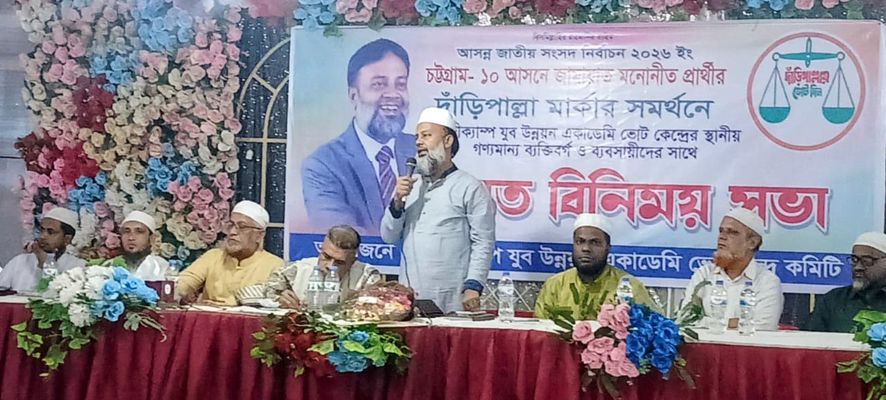 চট্টগ্রাম–১০ আসনের প্রার্থী ও বাংলাদেশ জামায়াতে ইসলামী চট্টগ্রাম মহানগরীর সাংগঠনিক সম্পাদক অধ্যক্ষ শামসুজ্জামান হেলালী স্থানীয় ব্যক্তিবর্গ ও ব্যবসায়ীদের সঙ্গে মতবিনিময় সভা করেছেন। বুধবার দুপুরে ১২ নম্বর সরাইপাড়া হাজী ক্যাম্প যুব উন্নয়ন একাডেমি স্কুল ভোট কেন্দ্র প্রাঙ্গণে এই মতবিনিময় সভা অনুষ্ঠিত হয়।