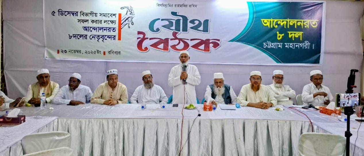 ৫ দফা দাবি বাস্তবায়নের লক্ষ্যে আন্দোলনরত আট দলের নেতৃবৃন্দ চট্টগ্রামে যৌথ বৈঠক করেছেন। আগামী ৫ ডিসেম্বর চট্টগ্রামের লালদিঘীর মাঠে বিভাগীয় মহাসমাবেশ সফল করার আহ্বান জানানো হয় বৈঠকে।