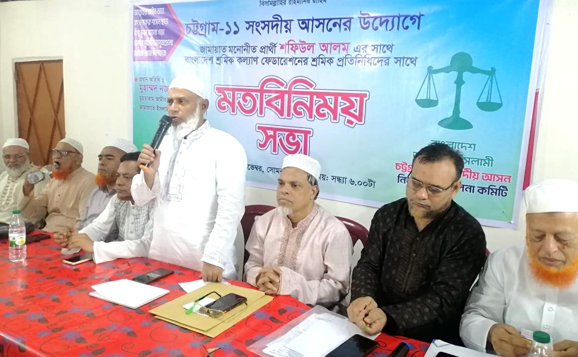 চট্টগ্রাম-১১ আসনে বাংলাদেশ জামায়াতে ইসলামী মনোনীত প্রার্থী শফিউল আলমের সমর্থনে বন্দর শ্রমিক কল্যাণ ফেডারেশন নেতৃবৃন্দের উদ্যোগে মতবিনিময় সভা অনুষ্ঠিত হয়েছে। মঙ্গলবার সন্ধ্যায় বন্দর শ্রমিক কল্যাণ ফেডারেশনের কার্যালয়ে এ সভা অনুষ্ঠিত হয়।