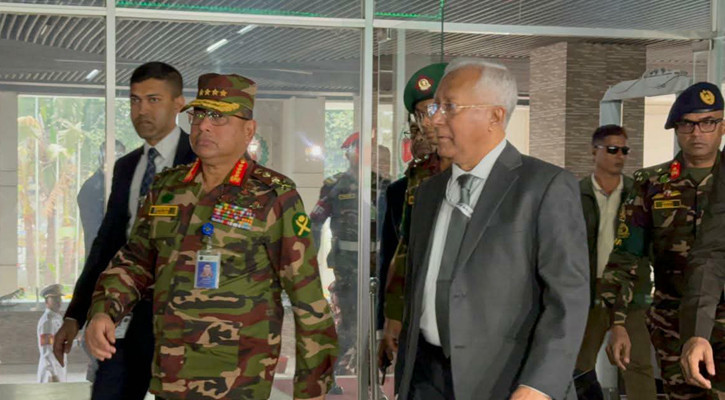 এর আগে একে একে ইসি ভবনে প্রবেশ করেন তিন বাহিনীর প্রধানরা। প্রথমে সেনাবাহিনীর প্রধান জেনারেল ওয়াকার-উজ-জামান এরপরে নৌবাহিনী প্রধান অ্যাডমিরাল মোহাম্মদ নাজমুল হাসান ও বিমান বাহিনী প্রধান এয়ার চিফ মার্শাল হাসান মাহমুদ খাঁন ইসিতে আসেন।