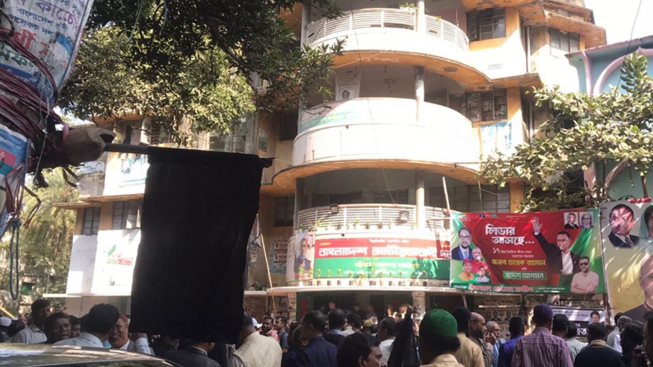 নাসিমন ভবনে গিয়ে দেখা যায়, অফিসের বাইরে চেয়ার নিয়ে পকেটে কালো ব্যাজ লাগিয়ে সারিবদ্ধভাবে বসে আছেন দলের বিভিন্ন পর্যায়ের নেতারা। নগরীর বিভিন্ন এলাকা থেকে দলীয় নেতাকর্মীরা সেখানে ভিড় করছেন।